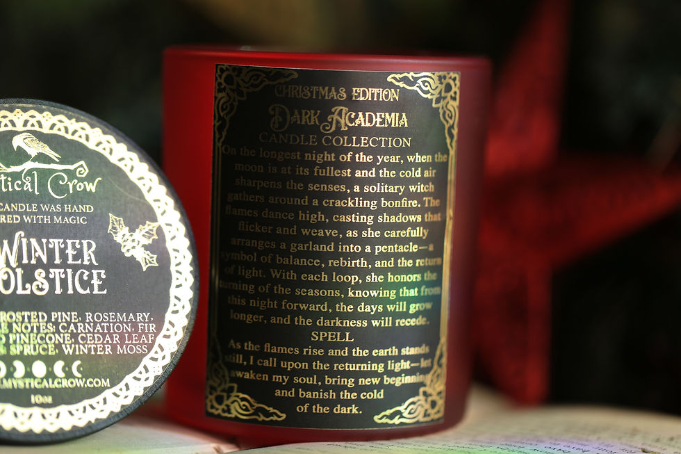 Experience the dark allure of our handmade, 100% soy candles at The Mystical Crow. Inspired by the elegance of the Victorian era, dark academia, and the haunting beauty of Edgar Allan Poe, each candle is crafted to transport you to another world. With carefully blended scents designed to evoke shadowed libraries, whispered spirits, and timeless mysteries, these candles set the perfect atmosphere for reflection, ritual, or simply embracing the magic of the unknown.